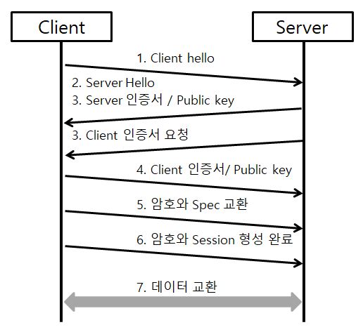 서버-클라이언트 간 데이터 전송 전 인증할 수 있도록 사용할 암호 알고리즘을 결정하고 키 분배 작업을 수행