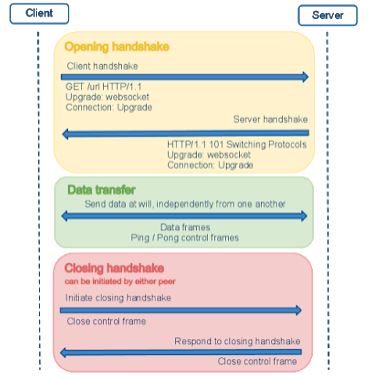 웹 소켓 프로토콜은 웹 브라우저(또는 다른 클라이언트 애플리케이션)와 웹 서버 간의 통신을 허용하며, HTTP 풀과 같은 반 이중 모드에 비해 서버와의 실시간 데이터 전송을 쉽게 합니다. 이는 클라이언트가 요청하는 것이 아니라 서버가 클라이언트에 콘텐츠를 전송할 수 있는 표준화된 방법을 제공함으로써 가능해졌습니다. 또한, 연결이 유지되면 메시지를 통해 앞뒤로 이동할 수 있으며, 이러한 방식으로 클라이언트와 서버 간에 양방향 대화가 발생할 수 있습니다. 통신은 TCP 포트 80(443 TLS 암호화 연결용)을 통해 이루어지며 방화벽을 통해 웹이 아닌 인터넷 연결을 차단하는 여러 환경에서 유용합니다. 간단한 양방향 브라우저 서버 통신은 혜성 등 스톱 갭 기술을 사용하여 비표준 방식으로 작동합니다.