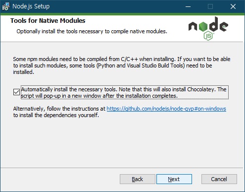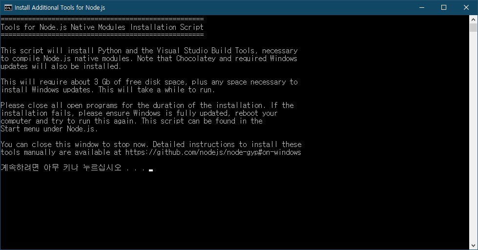 9. 설치가 완료되면 Install Additional Tools for Node.js(추가 도구 설치) 화면이 나타납니다. 아무 키나 눌러 설치를 진행하면 됩니다.