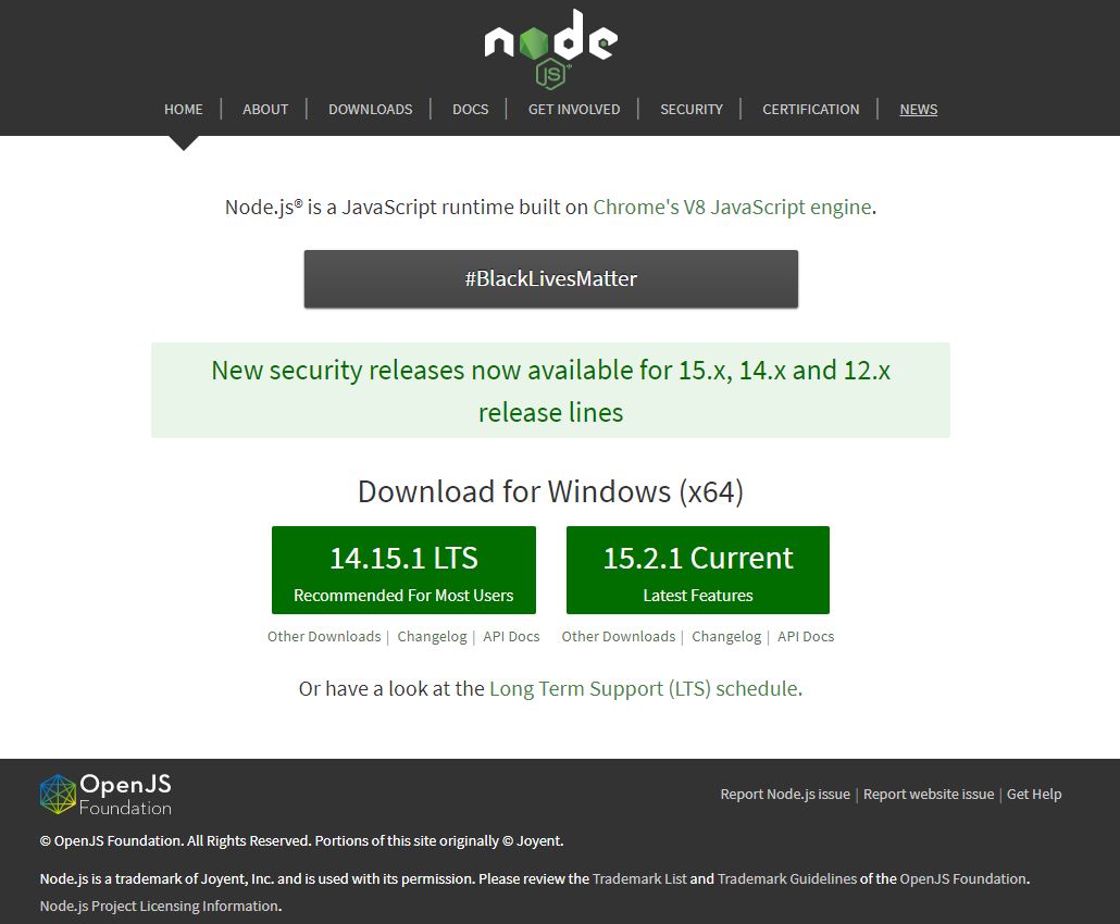 노드에서는 버전을 6개월마다 1씩 올립니다. 버전은 최초 1부터 현재(2020년 11월) 기준 15 버전이며 이전에 14, 13 버전들도 있었습니다. 그러나 홀수 버전은 LTS를 지원하지 않고 15버전이 나오면 14 버전은 사라지는 방식입니다. 추후에 버전이 높아져서 16버전이 나오게 된다면 15버전이 LTS가 됩니다.