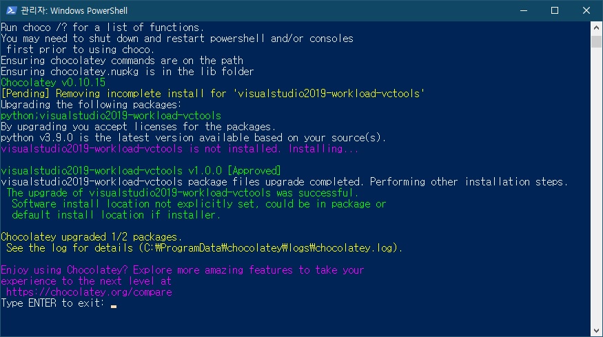 11. 잠시 기다린 후 설치가 완료되면 Type ENTER to exit: 라고 표시됩니다. 엔터 키를 눌러 종료합니다.
