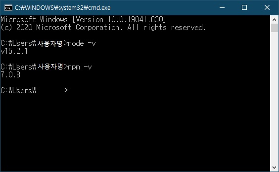 npm 버전이 명령 프롬프트 창에 위와 같이 나온다면 설치가 정상적으로 완료된 것입니다. (설치하는 시점에 따라 버전 숫자는 달라질 수 있습니다.) 그러나 버전 숫자가 나오지 않고 다른 에러 메시지가 나온다면 다시 처음부터 설치를 진행해야 합니다.
